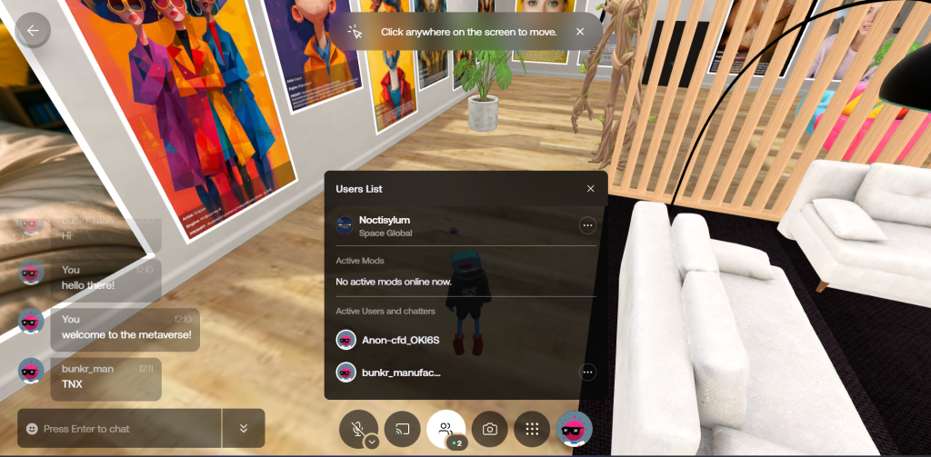 Можеш да истражујеш сам, или у режиму за више играча где видиш друге посетиоце у реалном времену и можеш да комуницираш са њима путем текстуалног или гласовног чета. Када наиђеш на рад који те занима, можеш да га ставиш у фокус и добијеш детаљне информације о њему. Звук се понаша природно у простору, појачава се како се приближаваш извору и слаби како се удаљавујеш. Видео радови долазе са пуном контролом, као у претраживачу. Можеш чак и да сурфујеш вебом директно унутар метаверзума, без напуштања простора. Можеш и да поделиш екран, што отвара могућности за презентације и заједничка искуства у реалном времену. Можеш да оставиш коментар који остаје трајно видљив, а простор омогућава и организацију евената, пројекција, изложби и дискусија.